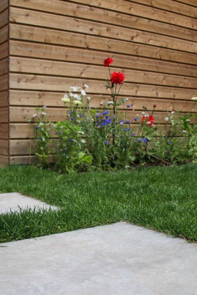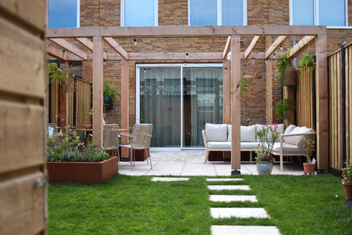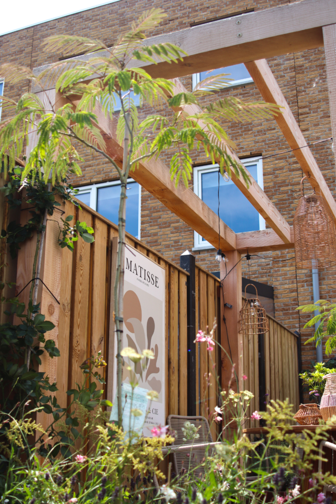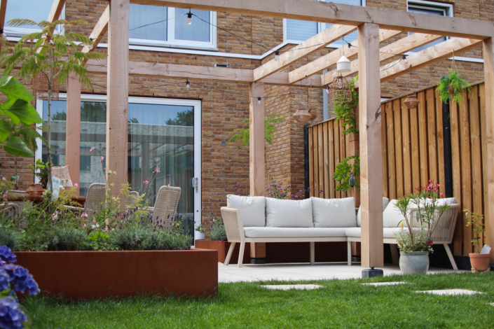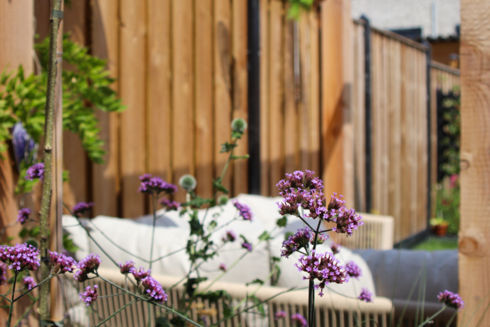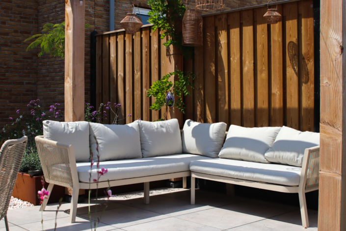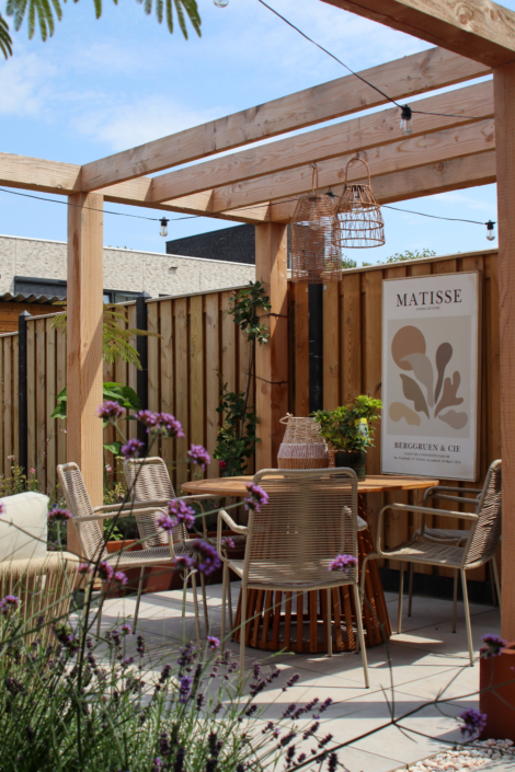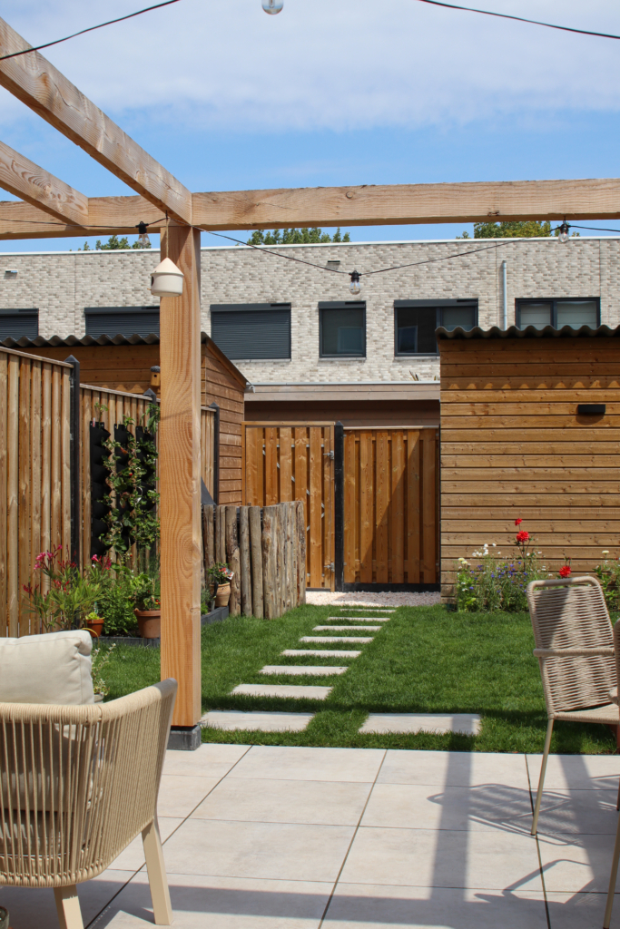 In een nieuwbouwwijk in Middelburg is deze tuin omgetoverd tot een sfeervolle, eigentijdse plek om te ontspannen. Een strak tegelpad door het gras leidt naar een ruim terras om te ontspannen. De borders zijn gevuld met een vrolijke mix van bloeiende planten. Een knus hoekje met tomaten- en aardbeienplantjes zorgt zelfs voor een vleugje moestuin. De houten schutting en bijpassende deur geven de tuin een warme, natuurlijke uitstraling.