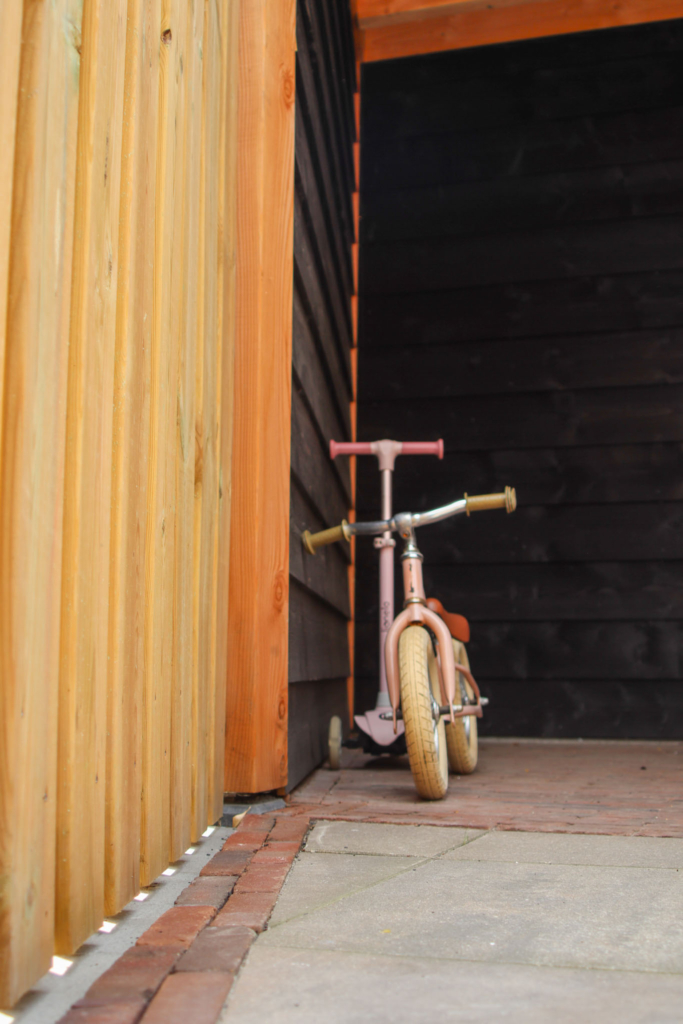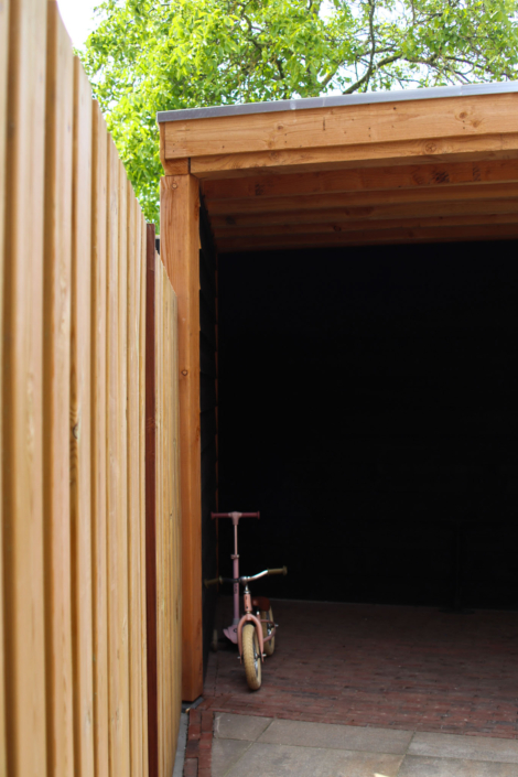De finishing touch voor deze prachtige tuin waar we vorig jaar mee gestart zijn. Een ruime, houten schuur, die doorloopt als overkapping. Multifunctioneel: buiten even snel wat spullen stallen en binnen de waardevolle spullen achter slot en grendel bergen.
